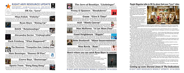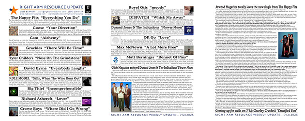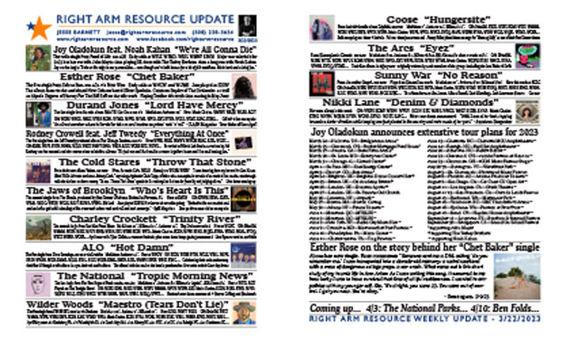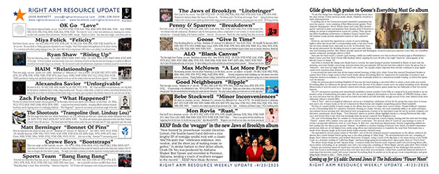 Newsletter Click the image below to read the most recent Right Arm Resource newsletter with the latest adds and information for all current projects. Additionally, on the back page, you’ll find Atwood Magazine’s conversation with Royel Otis, as well as a look at my upcoming projects. Or click here to read our archived newslettersNovember 26, 2025November 19, 2025November 12, 2025November 5, 2025October 29, 2025October 22, 2025October 15, 2025October 8, 2025October 1, 2025September 24, 2025September 17, 2025September 10, 2025September 3, 2025August 27, 2025August 20, 2025August 13, 2025August 6, 2025July 30, 2025July 23, 2025July 16, 2025July 9, 2025July 2, 2025June 25, 2025June 18, 2025June 11, 2025June 4, 2025May 28, 2025May 21, 2025May 14, 2025April 30, 2025April 23, 2025April 16, 2025April 9, 2025April 2, 2025March 26, 2025March 19, 2025March 12, 2025March 5, 2025February 26, 2025February 19, 2025February 12, 2025February 5, 2025January 29, 2025January 22, 2025January 15, 2025January 8, 2025December 4, 2024November 27, 2024November 20, 2024November 13, 2024November 6, 2024October 30, 2024October 23, 2024October 16, 2024October 9, 2024October 2, 2024September 25, 2024September 11, 2024September 4, 2024August 28, 2024August 21, 2024August 14, 2024August 7, 2024July 31, 2024July 24, 2024July 17, 2024July 10, 2024July 3, 2024June 26, 2024June 19, 2024June 12, 2024June 5, 2024May 29, 2024May 22, 2024May 15, 2024May 1, 2024April 24, 2024April 17, 2024April 10, 2024April 3, 2024March 27, 2024March 20, 2024March 13, 2024March 6, 2024February 28, 2024February 21, 2024February 14, 2024February 7, 2024January 31, 2024January 24, 2024January 17, 2024January 10, 2024December 6, 2023November 22, 2023November 8, 2023November 1, 2023October 25, 2023October 18, 2023October 11, 2023October 4, 2023September 20, 2023September 13, 2023September 6, 2023August 30, 2023August 23, 2023August 16, 2023August 9, 2023July 26, 2023July 19, 2023July 12, 2023July 5, 2023June 28, 2023June 21, 2023June 14, 2023June 7, 2023May 31, 2023May 24, 2023May 17, 2023May 10, 2023April 26, 2023April 19, 2023April 12, 2023April 5, 2023March 29, 2023March 22, 2023March 15, 2023March 8, 2023March 1, 2023February 22, 2023February 15, 2023February 8, 2023February 1, 2023January 25, 2023January 18, 2023January 11, 2023January 4, 2023November 30, 2022November 16, 2022November 9, 2022November 2, 2022October 26, 2022October 19, 2022October 12, 2022October 5, 2022September 28, 2022September 21, 2022September 14, 2022September 7, 2022August 31, 2022August 24, 2022August 17, 2022August 10, 2022July 27, 2022July 20, 2022July 13, 2022July 6, 2022June 29, 2022June 22, 2022June 15, 2022June 8, 2022June 1, 2022May 18, 2022May 11, 2022April 27, 2022April 20, 2022April 13, 2022April 6, 2022March 30, 2022March 23, 2022March 16, 2022March 9, 2022March 2, 2022February 23, 2022February 16, 2022February 9, 2022February 2, 2022January 26, 2022January 19, 2022January 12, 2022January 5, 2022December 1, 2021November 24, 2021November 17, 2021November 10, 2021November 3, 2021October 27, 2021October 20, 2021October 13, 2021October 6, 2021September 29, 2021September 22, 2021September 8, 2021September 1, 2021August 25, 2021August 18, 2021August 11, 2021August 4, 2021July 28, 2021July 21, 2021July 14, 2021July 7, 2021June 30, 2021June 23, 2021June 16, 2021June 9, 2021June 2, 2021May 26, 2021May 19, 2021May 12, 2021May 5, 2021April 28, 2021April 21, 2021April 14, 2021April 7, 2021March 31, 2021March 24, 2021March 17, 2021March 10, 2021March 3, 2021February 24, 2021February 17, 2021February 10, 2021February 3, 2021January 27, 2021January 20, 2021January 13, 2021January 6, 2021December 9, 2020December 2, 2020November 25, 2020November 18, 2020November 11, 2020November 4, 2020October 28, 2020October 21, 2020October 14, 2020October 7, 2020September 30, 2020September 23, 2020September 16, 2020September 9, 2020September 2, 2020August 26, 2020August 19, 2020August 12, 2020August 5, 2020July 29, 2020July 22, 2020July 15, 2020July 8, 2020July 1, 2020June 24, 2020June 17, 2020June 10, 2020June 3, 2020May 27, 2020May 20, 2020May 13, 2020May 6, 2020April 29, 2020April 22, 2020April 15, 2020April 8, 2020April 1, 2020March 25, 2020March 18, 2020March 11, 2020March 4, 2020February 26, 2020February 19, 2020February 12, 2020February 5, 2020January 29, 2020January 22, 2020January 15, 2020January 8, 2020December 11, 2019November 27, 2019November 20, 2019November 6, 2019October 30, 2019October 23, 2019October 16, 2019October 2, 2019September 25, 2019September 18, 2019September 11, 2019September 4, 2019August 28, 2019August 21, 2019August 14, 2019July 31, 2019July 24, 2019July 17, 2019July 3, 2019June 26, 2019June 19, 2019June 12, 2019June 5, 2019May 29, 2019May 22, 2019May 8, 2019May 1, 2019April 24, 2019April 17, 2019April 10, 2019April 3, 2019March 27, 2019March 20, 2019March 6, 2019February 27, 2019February 20, 2019February 13, 2019February 6, 2019January 30, 2019January 23, 2019January 16, 2019January 9, 2019January 2, 2019December 12, 2018November 21, 2018November 14, 2018November 7, 2018October 31, 2018October 24, 2018October 17, 2018October 10, 2018October 3, 2018September 26, 2018September 19, 2018September 12, 2018September 5, 2018August 29, 2018August 22, 2018August 15, 2018August 1, 2018July 25, 2018July 18, 2018July 11, 2018June 27, 2018June 20, 2018June 13, 2018June 6, 2018May 30, 2018May 23, 2018May 9, 2018May 2, 2018April 25, 2018April 18, 2018April 11, 2018April 4, 2018March 28, 2018March 21, 2018March 7, 2018February 28, 2018February 21, 2018February 14, 2018February 7, 2018January 31, 2018January 24, 2018January 17, 2018January 10, 2018January 3, 2018November 15, 2017November 8, 2017October 25, 2017October 18, 2017October 11, 2017October 4, 2017September 27, 2017September 20, 2017September 13, 2017September 6, 2017August 30, 2017August 23, 2017August 16, 2017August 2, 2017July 26, 2017July 19, 2017July 12, 2017July 5, 2017June 28, 2017June 21, 2017June 14, 2017J